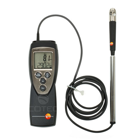 Анемометр Testo 416 представляет собой электронный блок с дисплеем и элементами управления (четырьмя функциональными кнопками), к которому при помощи кабеля стационарно подсоединен телескопический зонд с крыльчаткой с диаметром 16 мм и максимальной длиной рукоятки 890 мм.