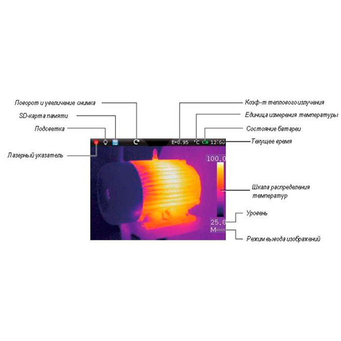 Изображение с инфракрасной камеры выводится на жидкокристаллический экран диагональю 3,5 дюйма. Он имеет чувствительный к касанию слой для удобного взаимодействия с элементами управления и пунктами меню. В качестве носителя информации используется съемная SD-карта. Благодаря ей можно переносить информацию на компьютер без подключения тепловизора с помощью кабеля.