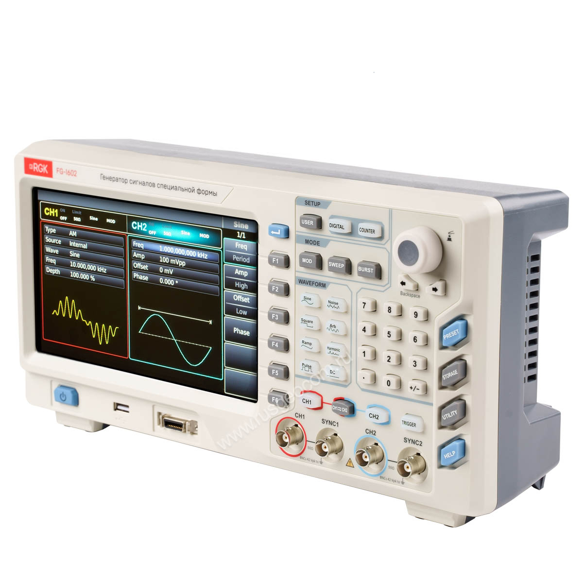 Двухканальный цифровой генератор сигналов произвольной формы RGK FG-1602 может воспроизводить сигналы с длительностью периода до 32 млн точек. Для хранения форм используется энергонезависимая внутренняя память объемом 7 Гб, в которой предварительно записано более 140 типовых сигналов различного вида, или съемный накопитель. Поддерживаются 13 типов модуляции сигналов встроенными средствами, режимы свипирования и пакетной передачи данных.