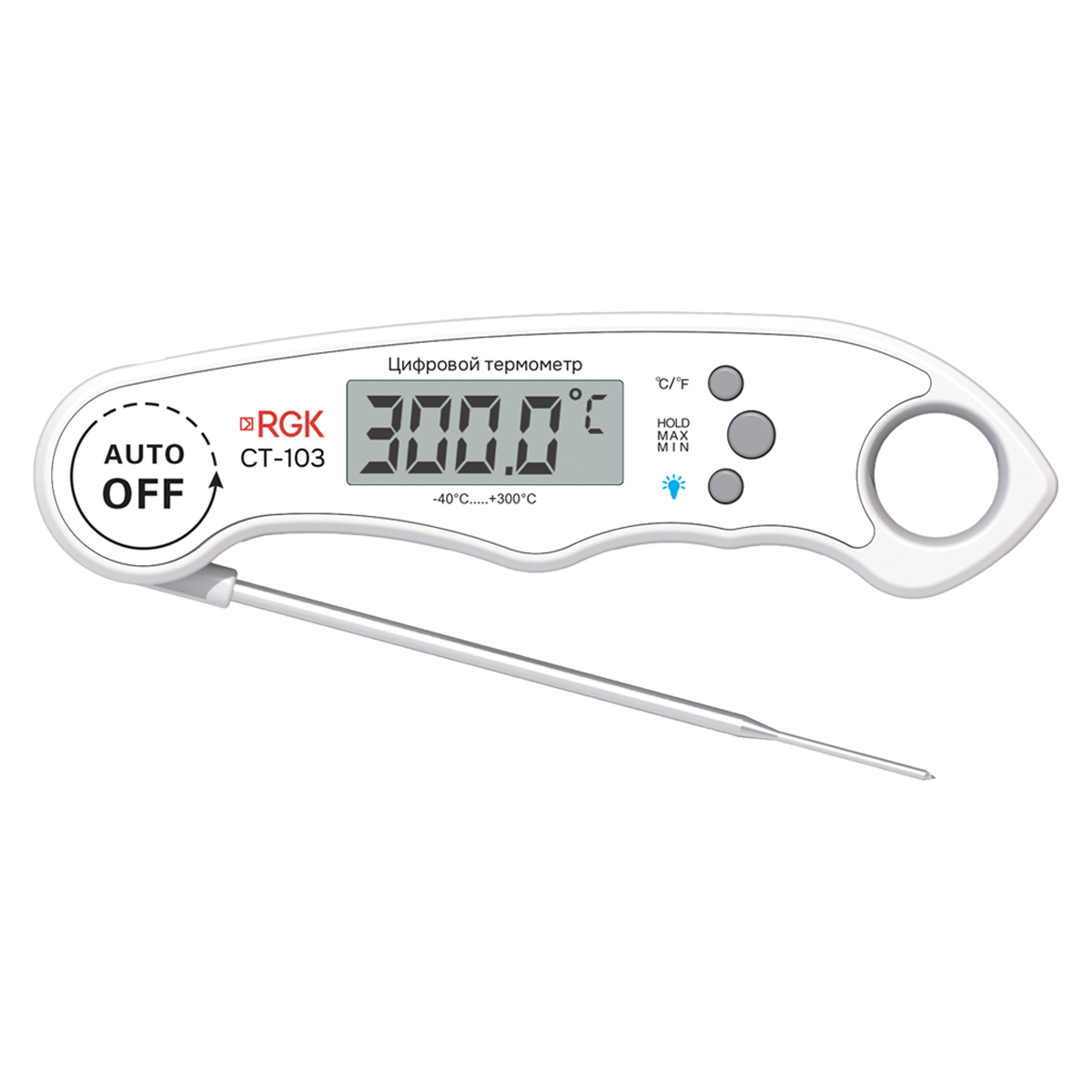 Термометр цифровой RGK CT-103 представляет собой контактный измеритель с тонким погружным зондом в оболочке из нержавеющей стали, предназначенный для контроля внутренней температуры жидкостей и суспензий, вязких и сыпучих материалов, пищевой продукции и т.п. Подобно модели CT-3, данное изделие выполнено в складывающемся форм-факторе, что обеспечивает удобство и безопасность его переноски в кармане, исключая риск случайного повреждения измерительного сенсора и травмирования персонала, поддерживая при этом больший перечень функций и обладая расширенным измерительным диапазоном.