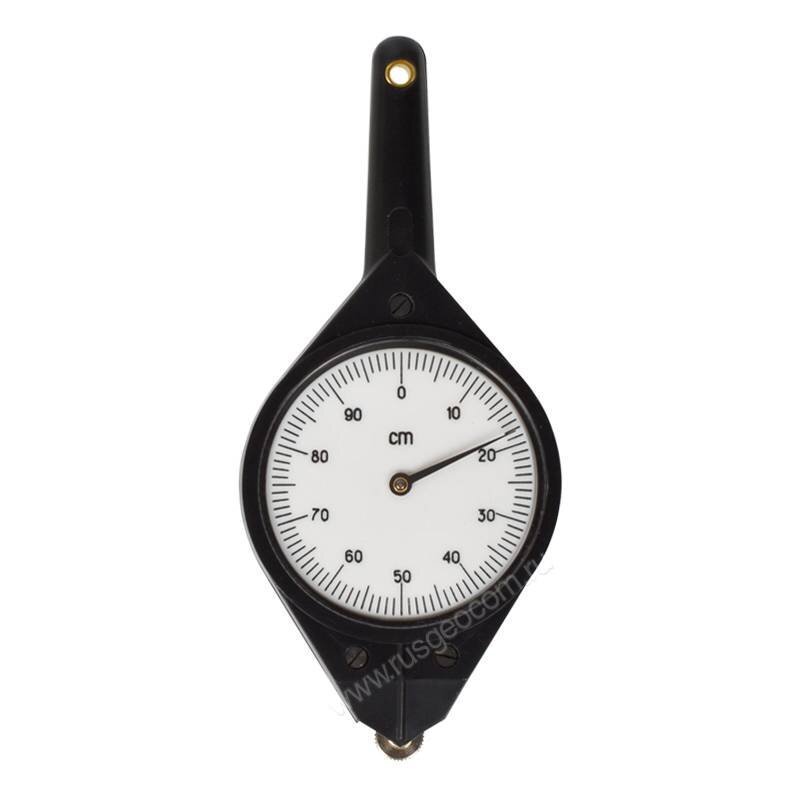 Курвиметр механический имеет метрическую и дюймовую шкалу. Цена деления метрической шкалы соответствует 1 см, дюймовой 0,05 дюйма. Погрешность измерения отрезка длиною 50 см не превышает 0,5%.