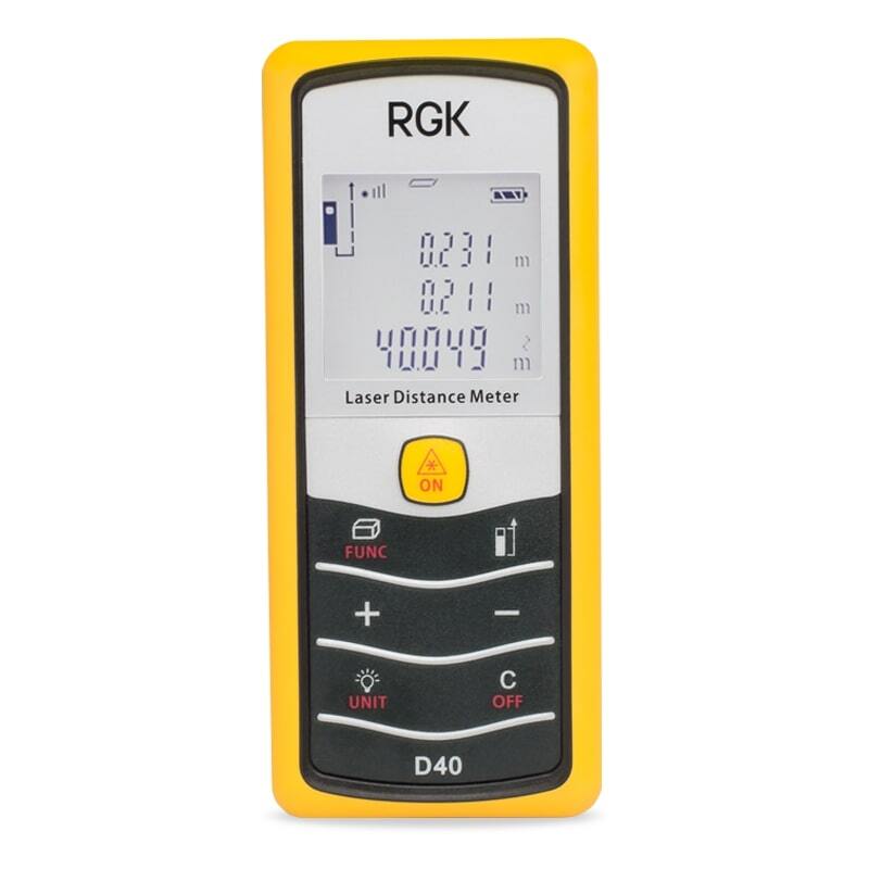 Лазерная рулетка RGK D40 представляет собой удобный, надежный и портативный инструмент, предназначенный как для профессиональных задач, так и для повседневного применения дома. Она станет отличной заменой обычной рулетки или мерной ленты, позволяя быстро и точно производить замеры как внутри помещений, так и вне их пределов благодаря мощному лазеру, способному измерять расстояния до 40–50 метров с высокой точностью ±2 мм. Прочный и компактный корпус устройства защищен от воздействия пыли и влаги по стандарту IP40, что гарантирует его долговечность и надежность эксплуатации. Встроенная память сохраняет до 50 последних результатов измерений, а яркий дисплей облегчает использование даже в условиях слабого освещения.Данная модель обладает рядом полезных функций: