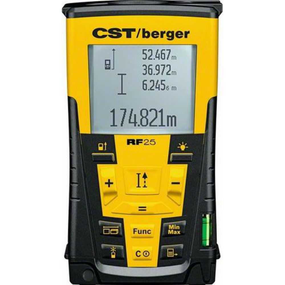 Подобно другим профессиональным моделям строительных дальномеров, лазерный дальномер CST/Berger RF25 способен производить одиночные, последовательные и косвенные измерения, работать в режиме разметки, осуществлять расчеты и другие операции. Измерение недоступных линейных параметров возможно выполнить по теореме Пифагора, используя простое, двойное или комбинированное измерение. Встроенный жидкостный уровень обеспечивает дополнительную точность при замере недоступных высот.