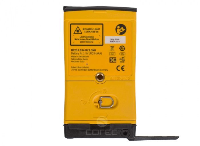 Дальномер RF25 обладает трехпозиционным упором, расположенным сзади корпуса, который легко извлекается без приложения дополнительных усилий после нажатия кнопки разблокировки в нижней левой части лицевой панели устройства. Это делает процесс измерения более удобным и эффективным, особенно при работе внутри помещений или труднодоступных местах.