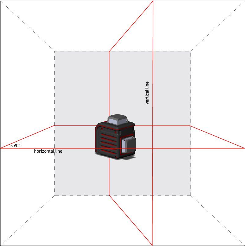 Удобство разметки: Лазерный уровень создает одновременно горизонтальную и вертикальную линию вокруг всей комнаты. Включив вертикальный луч, вы получите два пересекающихся под прямым углом (90°) луча – «лазерный крест». Такой крест удобно использовать для переноса меток между стенами или другими объектами.