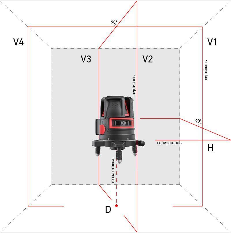 - Четыре вертикальные плоскости: устройство создает две взаимно перпендикулярные плоскости, необходимые для точного планирования и разделения зон в помещении, а также для установки перегородок, укладки плитки и монтажа потолков.
