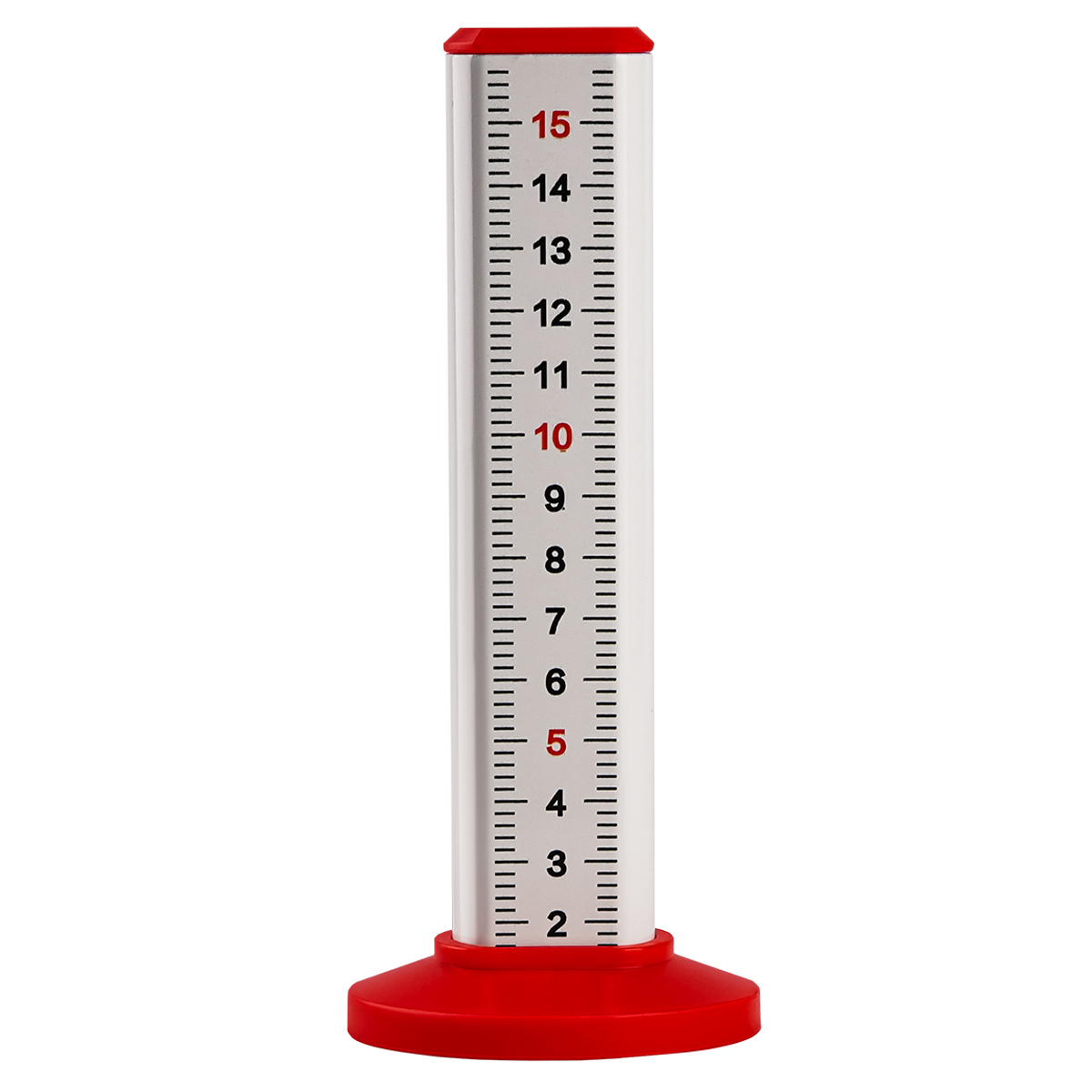 Ручной инструмент выполнен в виде металлического стержня скругленной формы, пустотелого внутри для облегчения веса. Он запрессован в устойчивое пластиковое основание диаметром 6,5 см, обеспечивающее перпендикулярность положения вертикальной оси изделия с опорной плоскостью. Изделие также снабжено верхней пластиковой заглушкой, которая предохраняет торцевую часть от повреждений. На рабочую поверхность измерителя нанесена сантиметровая разметка, с расстоянием между малыми делениями 2 мм, что позволяет считывать показания с точностью до миллиметра. Для наглядности цифры возле отметок 5, 10 и 15 см выполнены красным цветом.