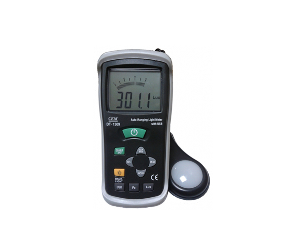 Люксметр CEM DT-1309 — портативный измеритель освещённости с выносным датчиком на длинном гибком проводе, с диапазоном измерений до 400 клк. Кремниевый фотодиод со спектрально корректирующим фильтром обеспечивает высокую точность измерений, а также длительный срок эксплуатации прибора.