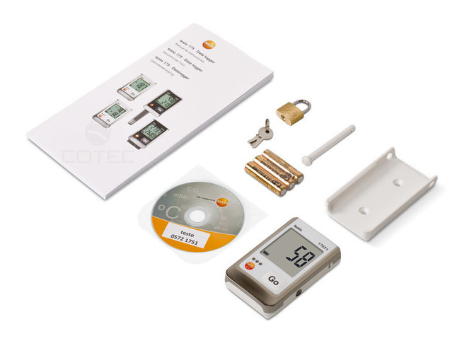 Стандартная комплектация: Логгер данных testo 175 T1, настенный кронштейн, элементы питания (3 х cтандартные батарейки типа ААА), заводской протокол калибровки.