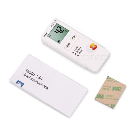 Комплектация: логгер данных температуры testo 184 T3, вкл. сертификат калибровки ISO (хранится в памяти testo 184 T3), батарейку и отрезок двухсторонней клейкой ленты для удобного крепления логгера.