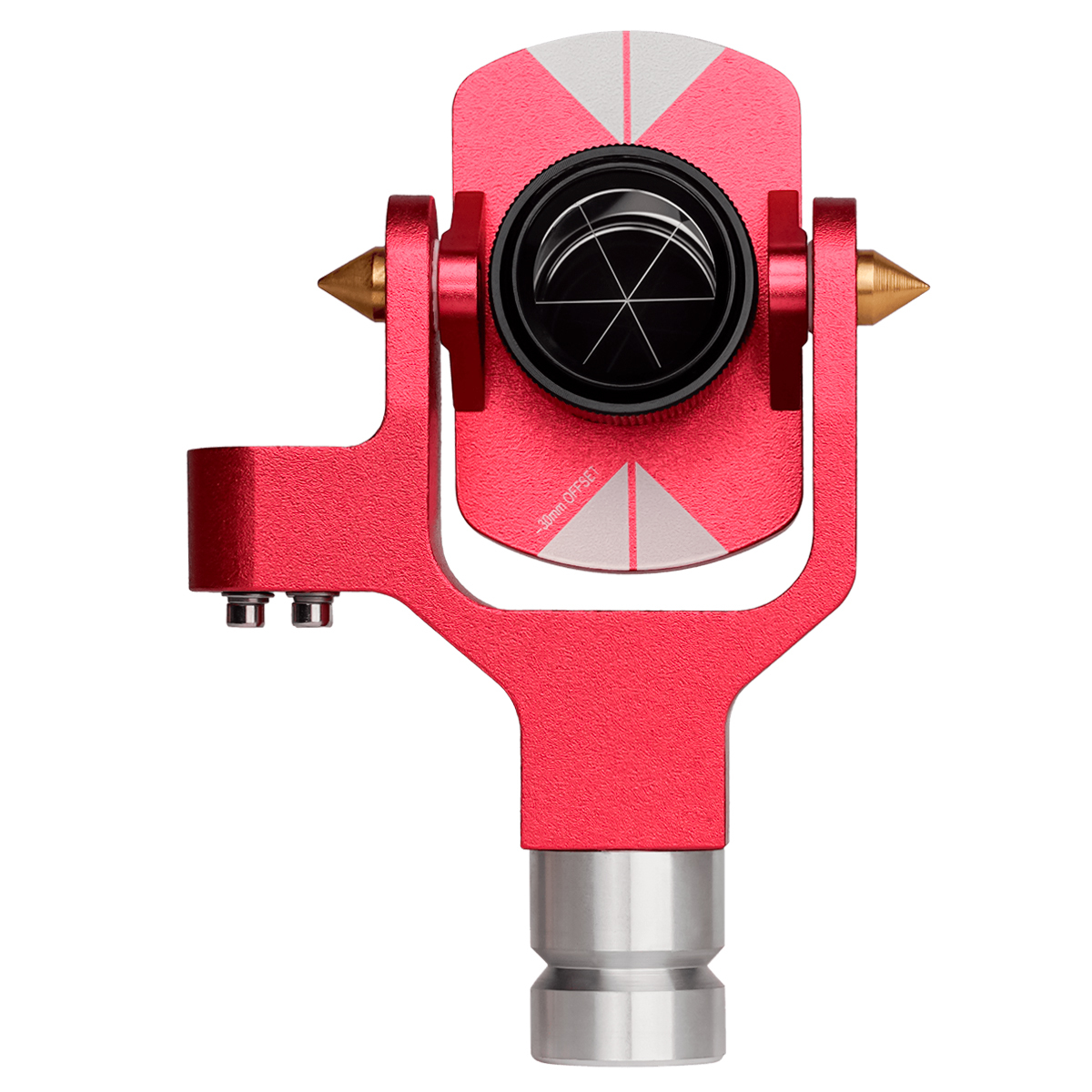 Фрезерованный U-образный держательгеодезического отражателя выполнен из анодированного алюминия и оборудован пузырьковым уровнем с поддержкой самостоятельной юстировки. Колба ватерпаса "утоплена" в металлической конструкции, что исключает ее случайное повреждение. Горизонтальная ось, обеспечивающая возможность произвольного наклона призмы, снабжена коническими выступами, что вместе с марками на креплении отражательного элемента упрощает наведение тахеометра на его центр.