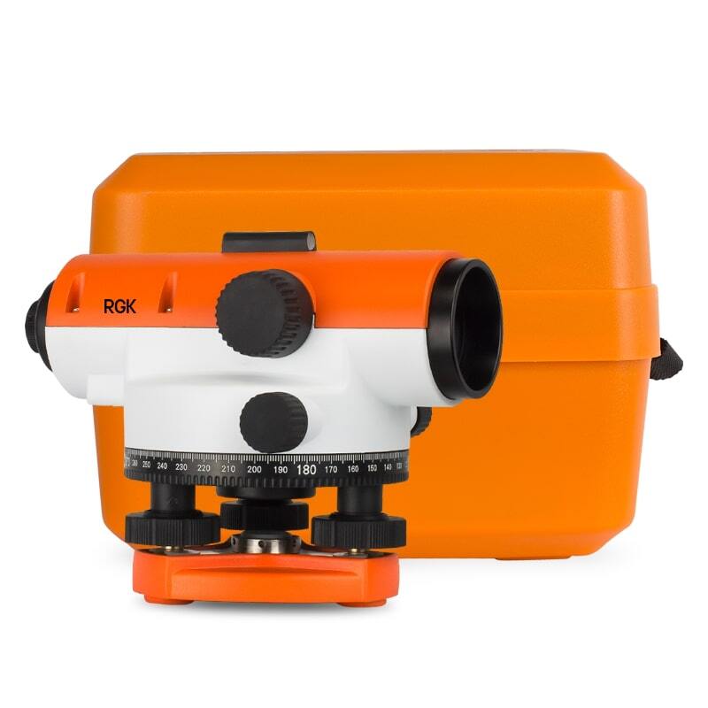 Стандартная комплектация: оптический нивелир RGK C-20, нитяной отвес, юстировочный набор, руководство по эксплуатации, транспортировочный кейс.