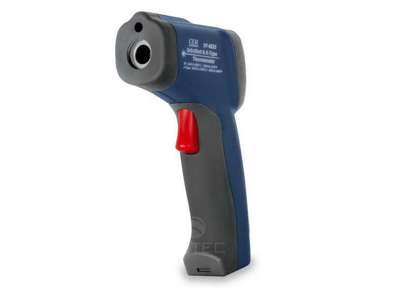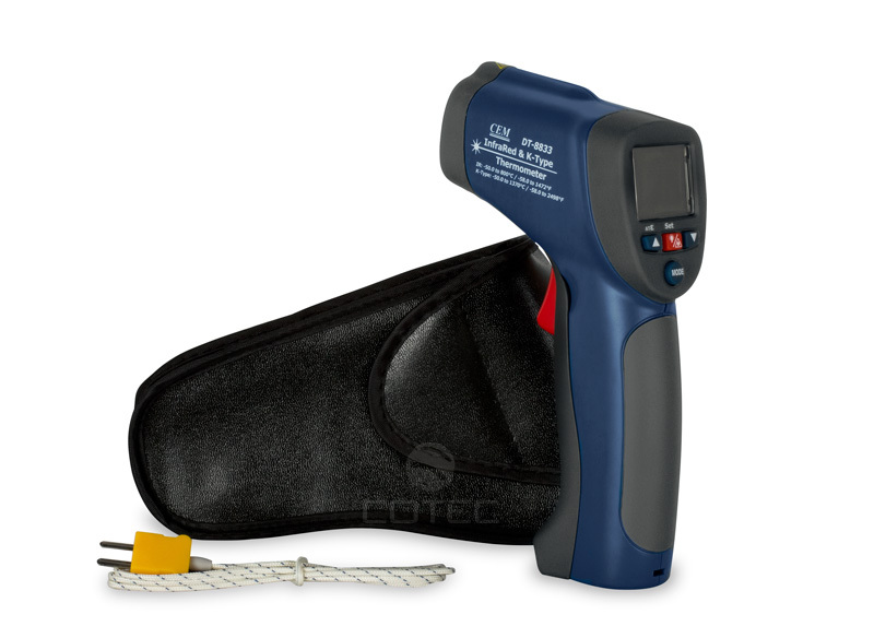 Профессиональный пирометр CEM DT 8833 представляет собой прибор, предназначенный для бесконтактного измерения поверхностных температур объектов. Широкий интервал измеряемых температур - от -50°C до +800°C - позволяет использовать пирометр на различных производствах для контроля технологических процессов и работы оборудования, а также в коммунальном хозяйстве для обнаружения утечек тепла. В модели DT 8833 предусмотрена возможность расширить температурный диапазон до 1370°C с помощью термопары, входящей в комплект устройства.