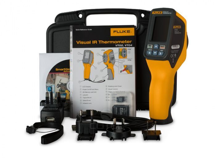 Стандартная комплектация: Термометр Fluke VT04, жесткий корпус, карта Micro-SD, адаптер карты Micro-SD для SD-карты, литий-ионный аккумулятор, зарядное устройство/блок питания Micro USB (включая переходники для разных мировых стандартов), печатное краткое руководство пользователя (английский, французский, немецкий, испанский, упрощенный китайский).
