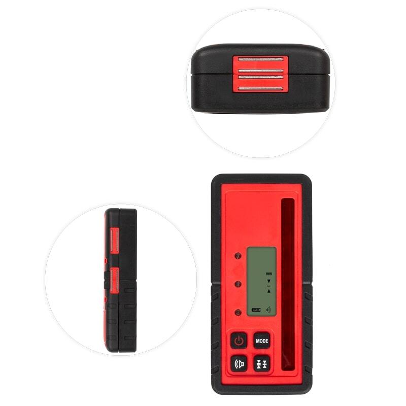 Приемник поддерживает три режима точности измерений, переключаемые нажатием кнопки. Наиболее точный режим фиксирует отклонения меньше чем 1 миллиметр, средний режим работает с погрешностью до 2,5 миллиметров, наименее точный — допускает ошибку до 5 миллиметров. Такая гибкость настройки позволяет адаптировать устройство под конкретные задачи и условия применения лазерного нивелира.