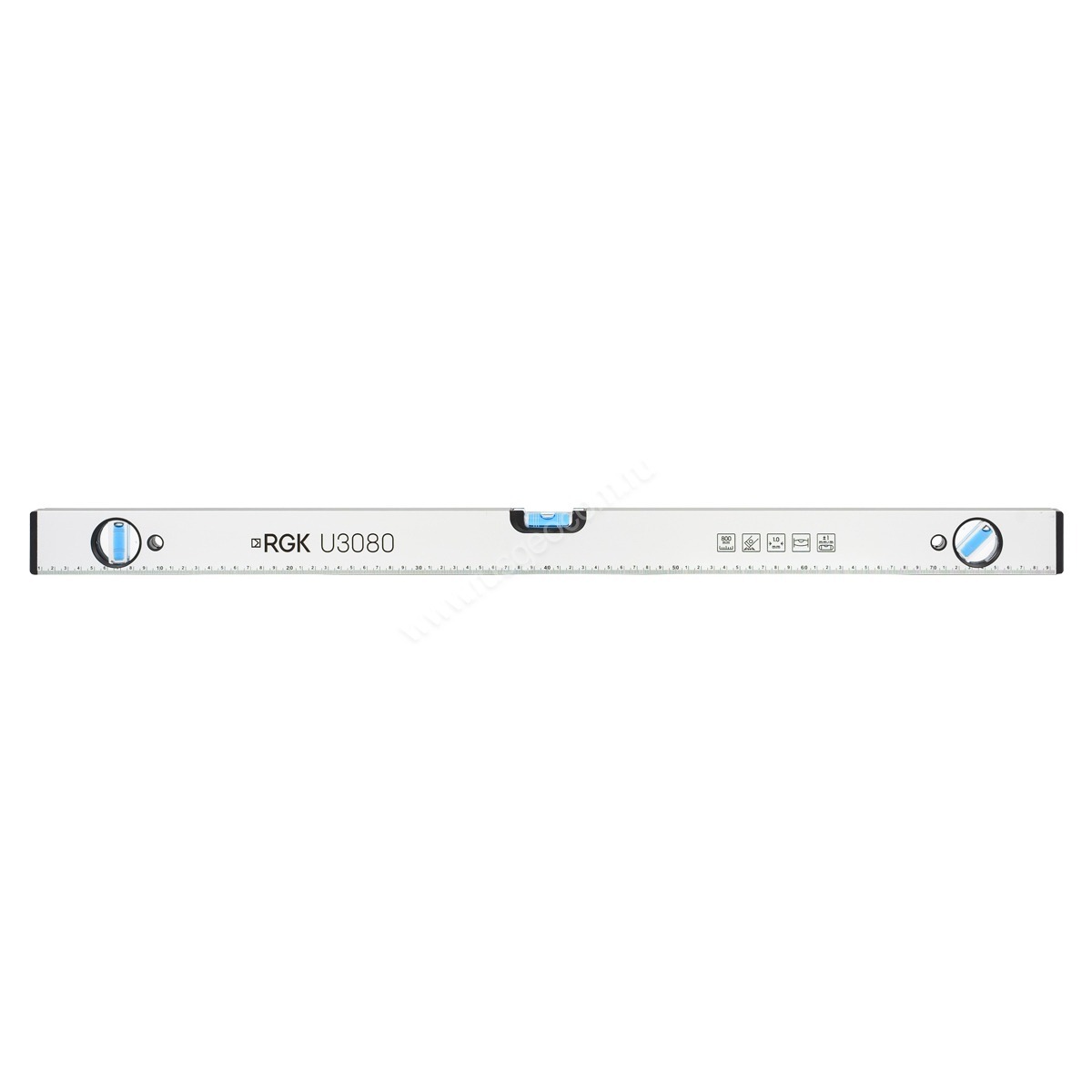 Прямоугольный корпус, рабочая длина которого составляет 80 см, изготовлен из алюминиевого профиля толщиной 1 мм, благодаря чему масса строительного уровня RGK U3080 не превышает 0,4 кг. Небольшой вес позволяет выполнять работы на весу длительное время. Противоударные торцевые вставки-заглушки предохраняют края рабочих поверхностей от случайных повреждений.