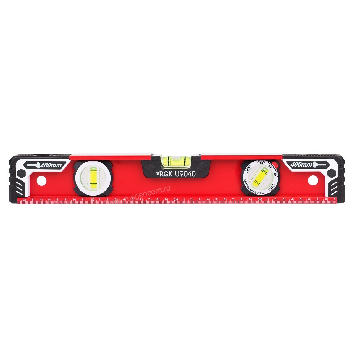 Пузырьковый строительный уровень RGK U9040 обеспечивает точность 1 мм/м. Длина 40 см позволяет использовать инструмент для проведения масштабных строительных работ по выравниванию полов, штукатурке стен и др.