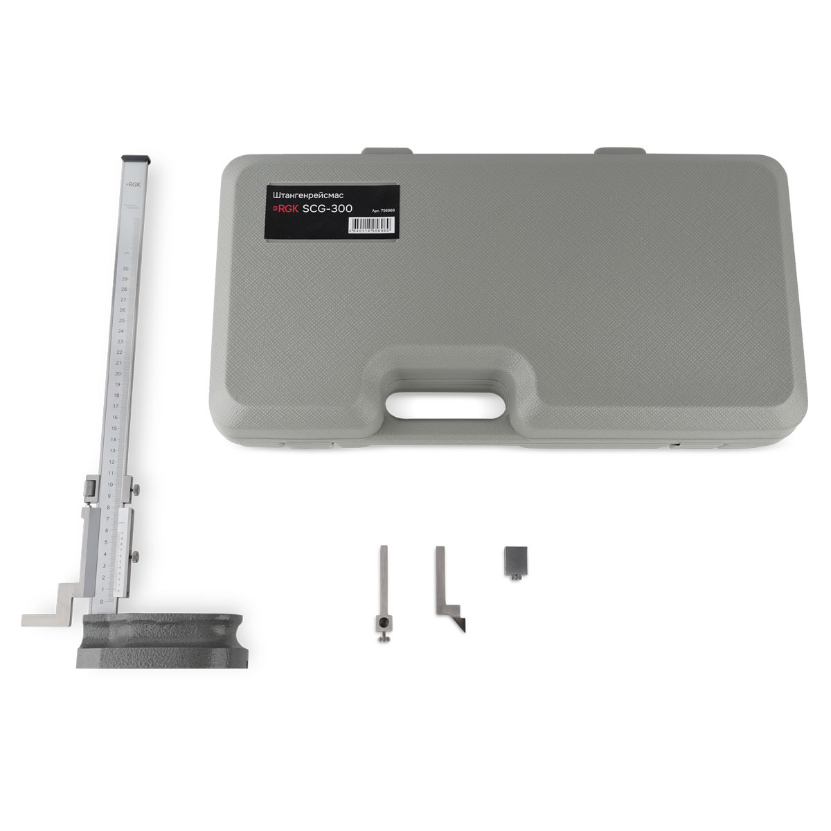 Название инструмента штангенрейсмас RGK SCG-300 расшифровывается так: SC — это штангенциркуль, G указывает на наличие глубиномера.