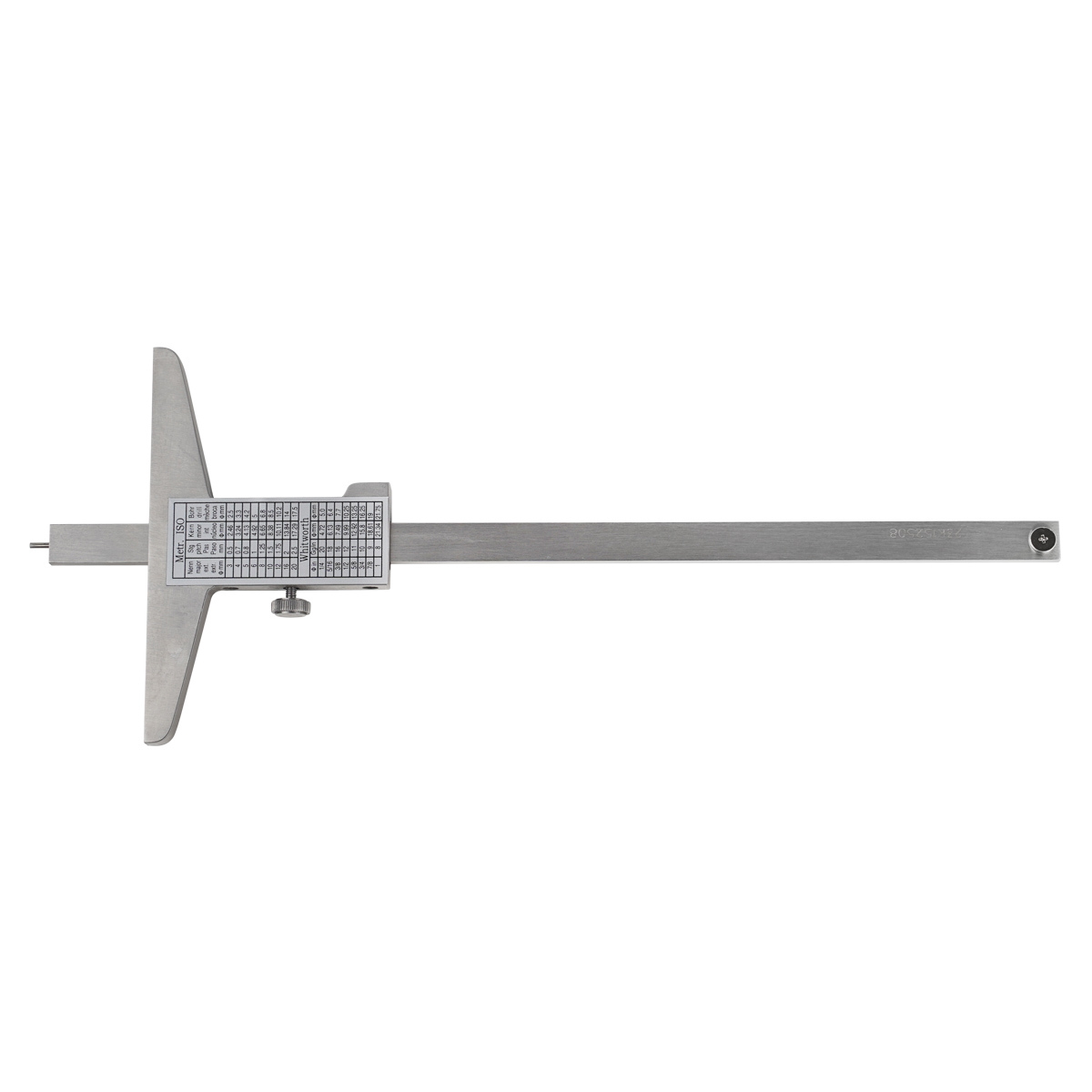 Штангенглубиномер имеет название SCGM-150. При этом аббревиатура расшифровывается так: SC — штангенциркуль, G — глубиномер, M — механическое исполнение, а число 150 указывает на максимально допустимую величину измерения в миллиметрах.