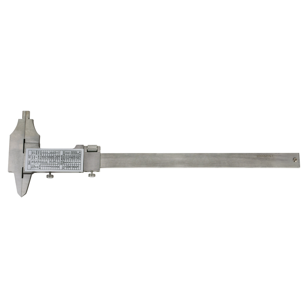 Конструкция штангенциркуля включает механизм точной настройки рамки, который оснащен отдельной фиксирующей деталью и микрометрическим винтом с большим маховиком. Это дает возможность точно выставлять требуемый зазор между губками, что особенно важно при разметочных операциях. На оборотной стороне прибора размещена справочная таблица, содержащая информацию о соответствии резьбовых соединений стандартам ISO и Витворта (метрическая и дюймовая системы), включая данные о подходящих сверлах для различных типоразмеров диаметров.