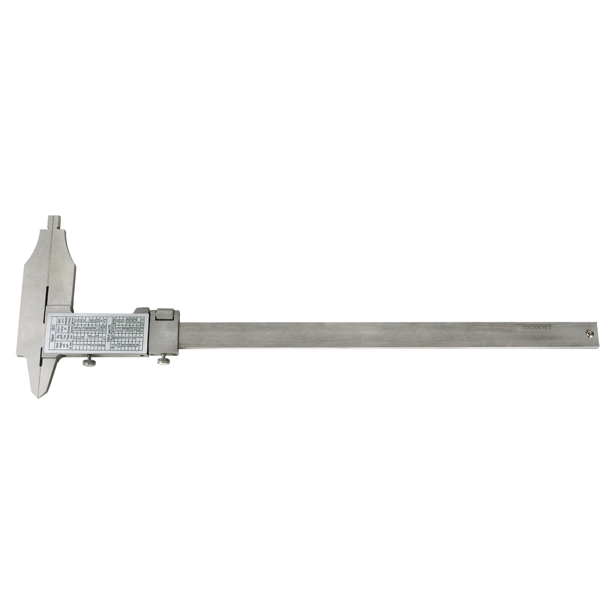 Заостренная форма верхних губок облегчает проведение замеров даже в труднодоступных зонах. Благодаря удлиненным нижним губкам, штангенциркуль удобен при определении размеров крупных цилиндрических объектов. Плоская внутренняя поверхность нижней части губок помогает более точно замерять наружную резьбу, тогда как округлая внешняя сторона используется для контроля диаметра отверстий и ширины пазов. На оборотной стороне инструмента расположена таблица, содержащая информацию о соответствии метрической и дюймовой резьбы различным размерам сверл.