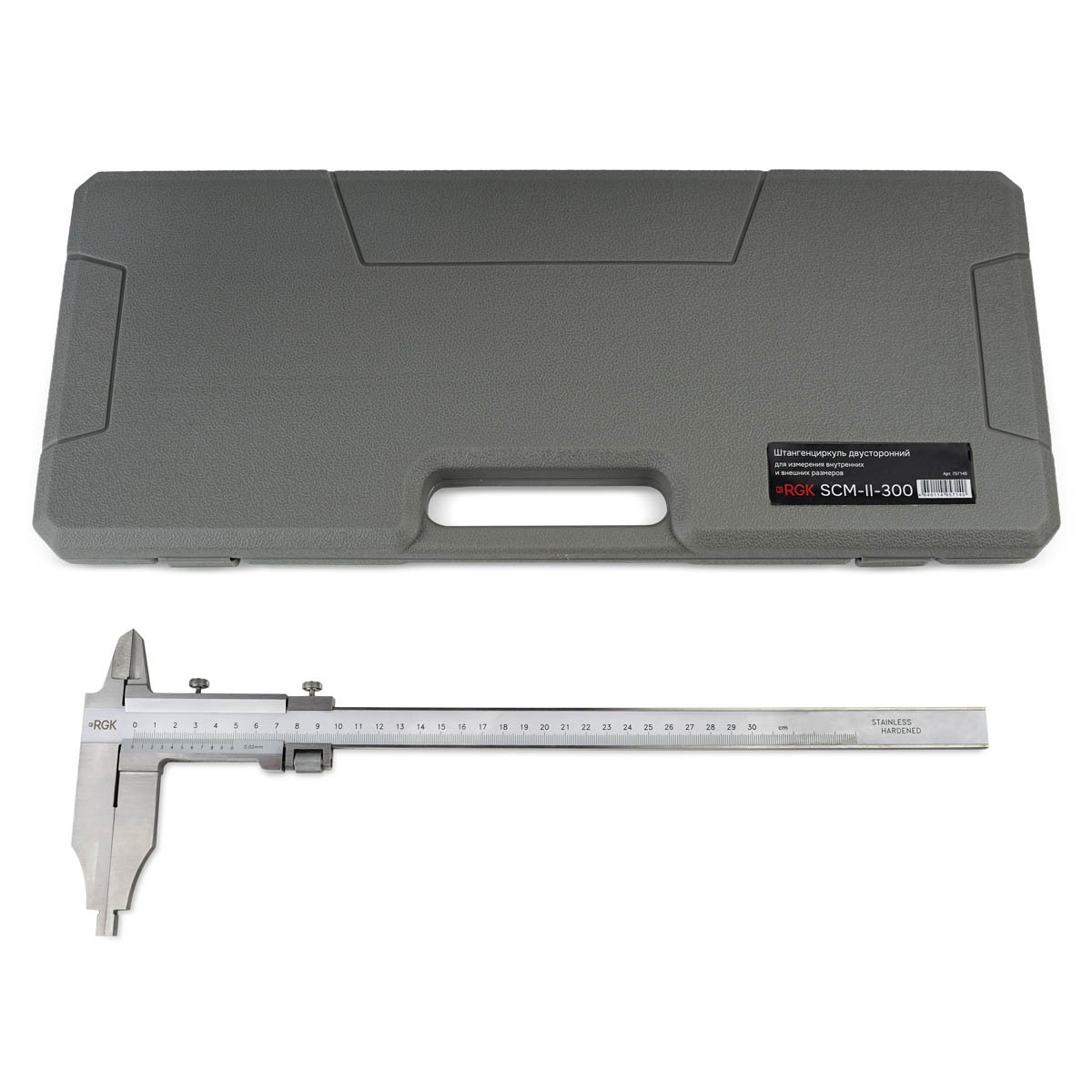 RGK SCM-II-300 — это качественный и высокоточный механический штангенциркуль с рабочим интервалом от 0 до 300 мм. Он оснащен нониусной шкалой, обеспечивающей точность снятия показаний до 0,02 мм. Особенностью этого прибора является наличие механизма точной настройки рамки с микрометрическим приводом, благодаря чему можно выполнять не только точные измерения, но и осуществлять разметочные работы. Дополнительно устройство может быть оборудовано стандартной оснасткой для разметки.