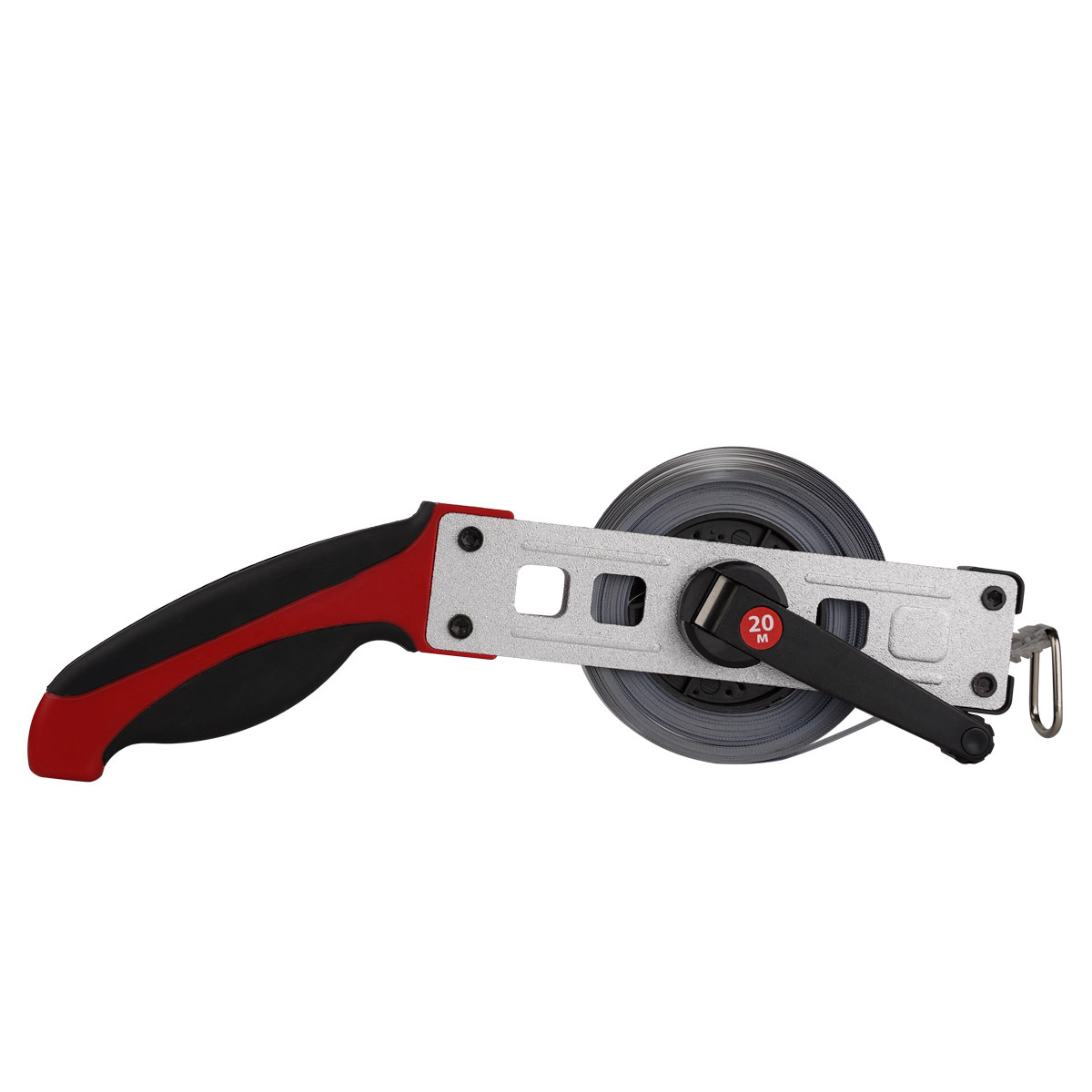 Мерная лента из нержавеющей стали характеризуется более высоким эксплуатационным ресурсом, по сравнению с углеродистым полотном, и лучше подходит для применения в жестких условиях промышленного производства. За счет открытой конструкции корпуса измерительная рулетка обладает достаточно небольшим весом. Рукоятка, с покрытием из термопластичной резины для предотвращения выскальзывания, дает возможность комфортно удерживать инструмент в процессе выполнения работ. Сворачивание полотна после замера производится вручную, с помощью механизма, снабженного приводной рукояткой, которая складывается в транспортном положении, обеспечивая уменьшение общих габаритов изделия.