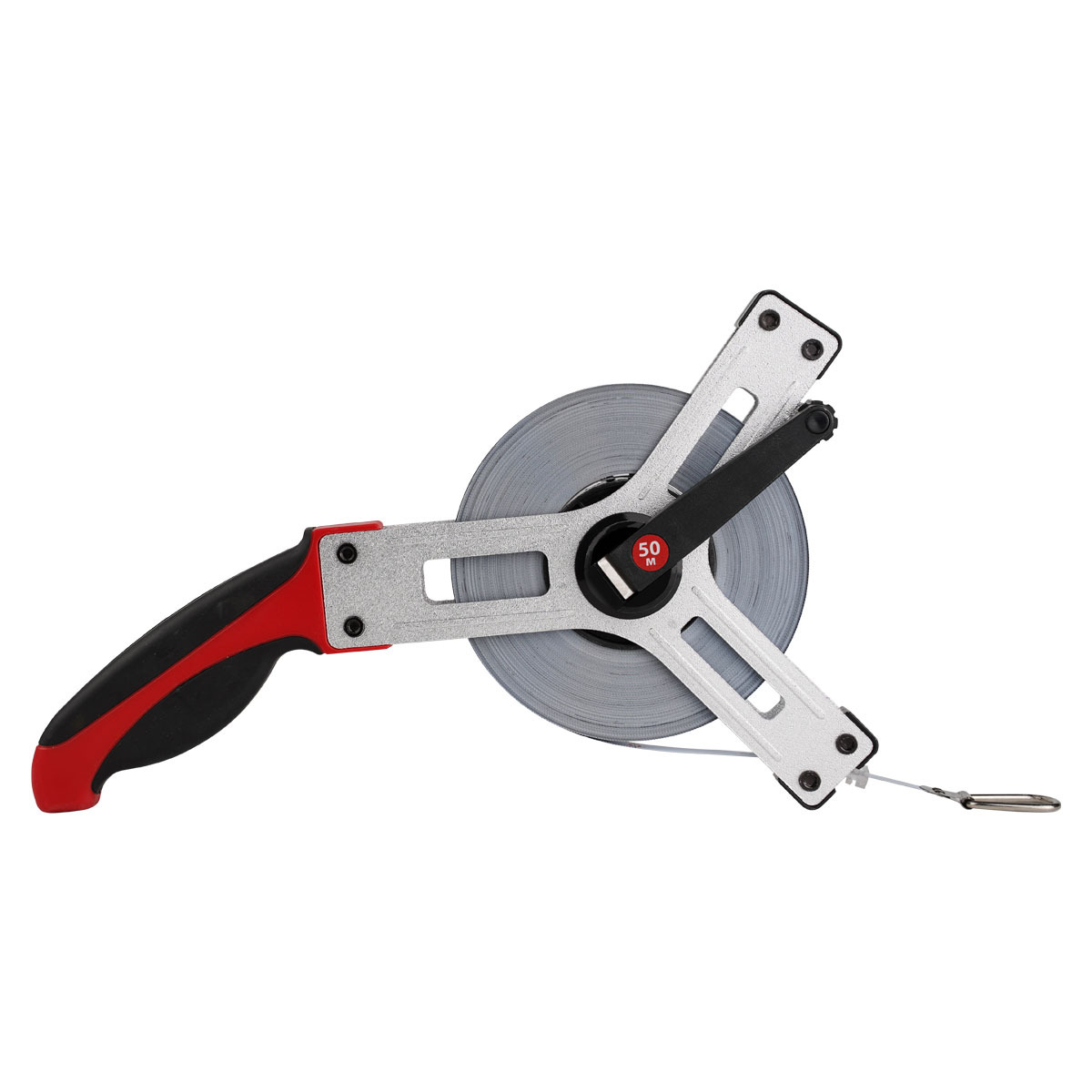 - Удобство использования – облегченный корпус открытого типа выполнен в виде рамки и оснащен эргономичной пластиковой ручкой с дополнительными накладками для комфортного хвата; механизм скручивания измерительного полотна с ручным приводом снабжен складывающейся рукояткой.