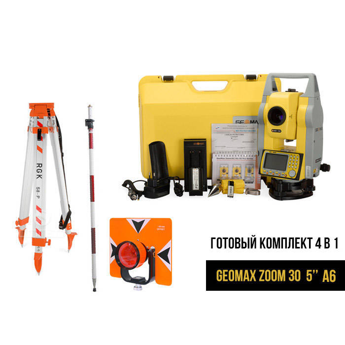 - Электронный тахеометр GeoMax Zoom30 5" A6 — многофункциональный геодезический инструмент с точностью измерения углов 5 секунд.