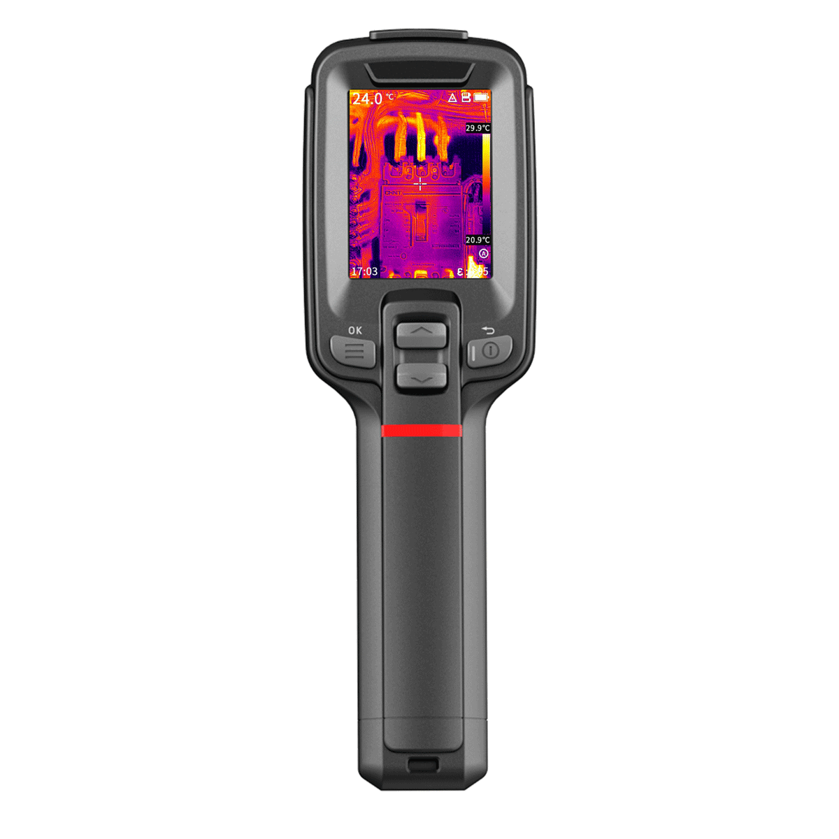 Прибор обладает высокой термочувствительностью 45 мК NETD. Он способен определять температуру в диапазоне от -20°С до +550°С с точностью 2°C. Он также имеет лазерный указатель и автоматически отслеживает горячие и холодные точки. На экране видна шкала от наименьшей до наибольшей температуры.