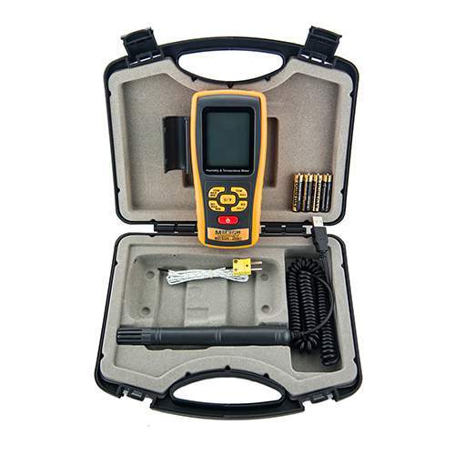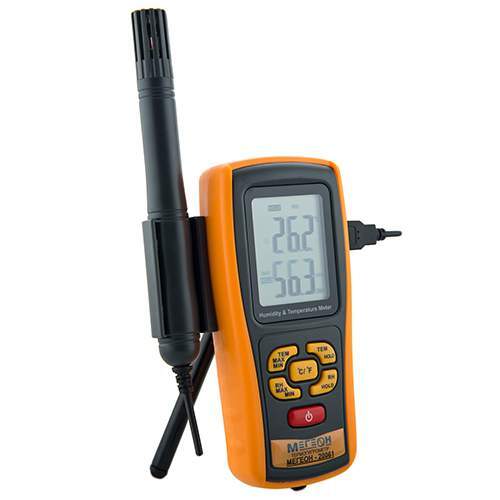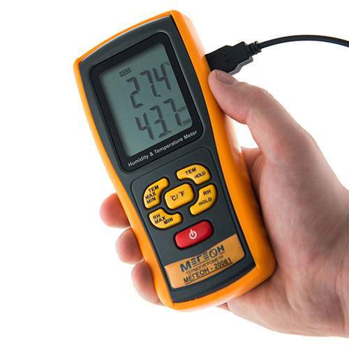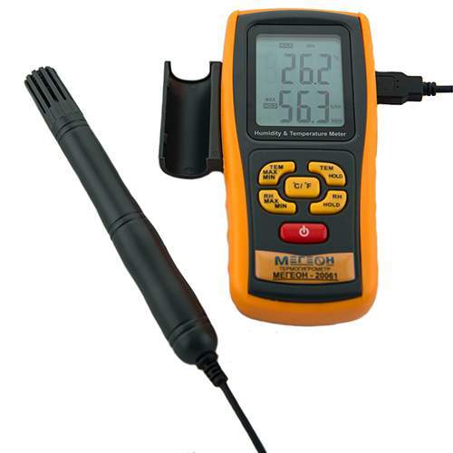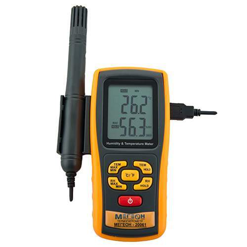 Функциональный термогигрометр МЕГЕОН 20061 применяется для высокоточного измерения температуры и влажности. Для этого в комплекте идёт термопара типа К и измерительный зонд. Предел температуры достигает 1000 °С, относительной влажности – 98%.