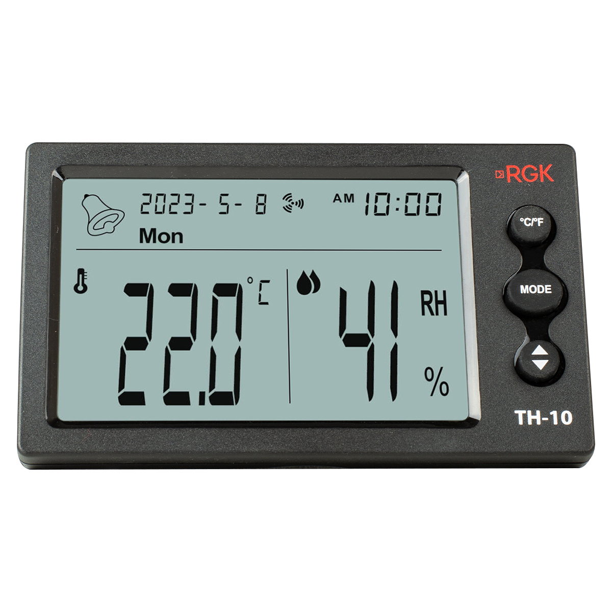 Электронный термогигрометр RGK TH-10 обновляет показания температуры и влажности раз в 10 с. Можно настроить прибор так, чтобы каждый час подавался звуковой сигнал, напоминающий о необходимости проверки климатических параметров. Отображение текущего времени и даты упрощает занесение данных в журнал и другую документацию.