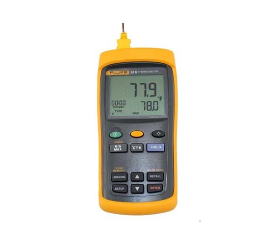 Под дисплеем находится кнопочная панель управления термометром. Термометр Fluke 53 II B позволяет сохранять до 500 измеренных значений благодаря встроенной памяти прибора. Вызов данных из памяти осуществляется с помощью функции Recall. Для передачи записанных данных на компьютер непосредственно с термометра он имеет ИК-порт. Программное обеспечение для синхронизации с ПК поставляется опционально.