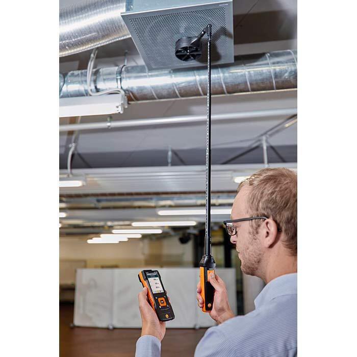 - Удобные измерения в воздуховодах: зонд-наконечник и Bluetooth-рукоятку можно легко присоединить с прочной телескопической рукоятке (длиной до 1 м), со шкалой, входящей в комплект поставки.