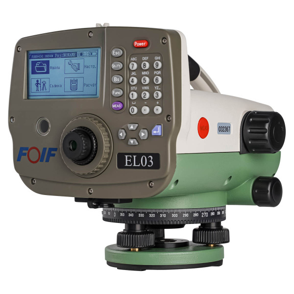 Электронный нивелир FOIF EL03 оснащен буквенно-цифровой клавиатурой с навигационными клавишами, что расширяет возможности ввода и редактирования данных через «меню проектов». 30-кратная оптика с 45-миллиметровым светосильным объективом защищена специальным козырьком. Верхняя рукоятка облегчает переноску и установку прибора на штатив. В верхней части корпуса расположено прицельное приспособление для предварительного наведения на цель.
